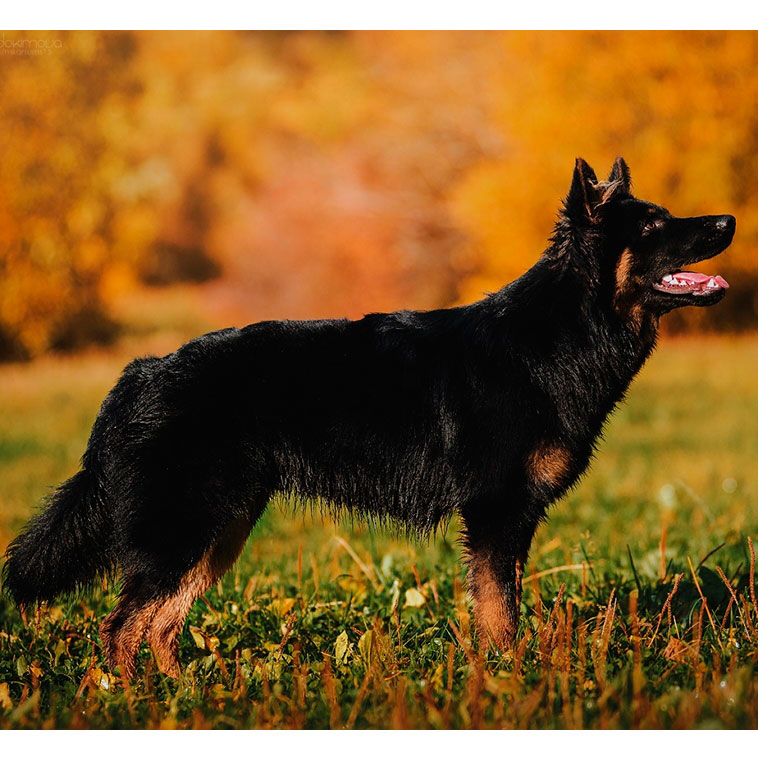 В области мордочки, кончиков ушей, передних конечностей не длинная. Но остальные части тела покрыты длинным волосяным покровом 5-12 см, с красивым отражающим блеском. Присутствует подшёрсток. Хвост опушен только с нижней стороны. Окрас - черный с рыжими подпалинами. Чем ярче рыжий оттенок, тем лучше. Бывают отметины с отчетливыми контурами.