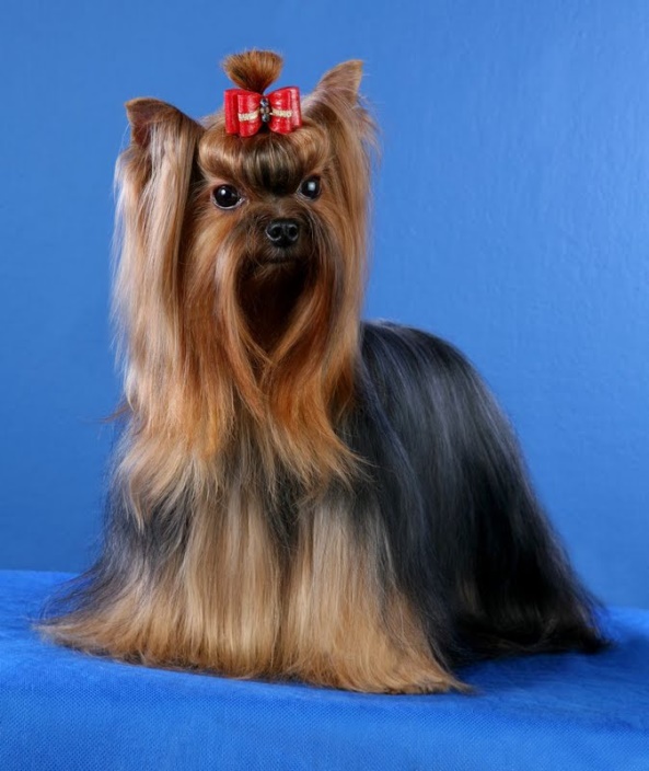 Йоркам необходим груминг. Для участия в выставках им с детства отращивают шерсть-мантию, стригут только “ушки” и между подушечками конечностей, а юбочка должна превышать длину лап на 1-2 см.