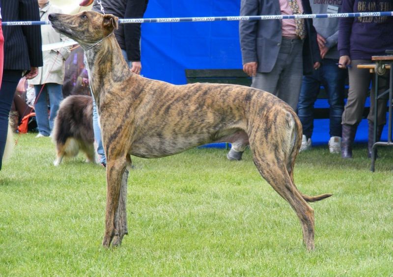 Голова клиновидной формы с широким лбом и мягким переходом в морду. Длина морды в 2 раза короче головы, что нехарактерно для собак борзых пород.